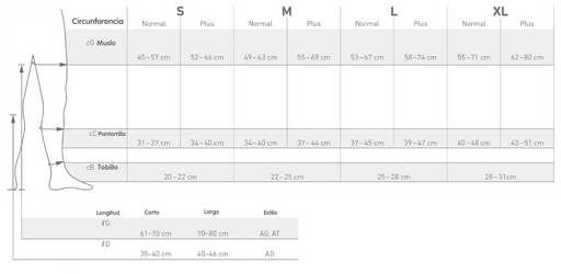También varían en tamaño: medias cortas hasta la rodilla, medias largas que cubren el muslo.